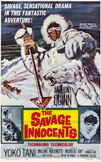 Next up would be The Savage Innocents, a much-maligned film about an Inuk the Eskimo and his search for a better life for his new wife and soon-to-be born son. The casting of Mexican actor Anthony Quinn as Inuk, though racist in a way (though more in casting than in performance), was not so out-of-the ordinary back in 1960. After all, this was just four years after the world watched in horror as John Wayne "played" Genghis Khan - and anyway, Quinn played everyone from Italians to Spaniards to Zorba the Freakin' Greek. If one is to be honest though, one would have to say they love this film. Beautifully shot (even within the shots that are obvious soundstage work) and quite enjoyable throughout (we also get to see a young Peter O'Toole who asked his name be taken off due to his voice being dubbed without his permission). If one were to name his guilty pleasure movies (though I feel no guilt) one would have to put The Savage Innocents on said list. The film does have at least one other fan, as Bob Dylan, after seeing the film, wrote "Quinn the Eskimo".